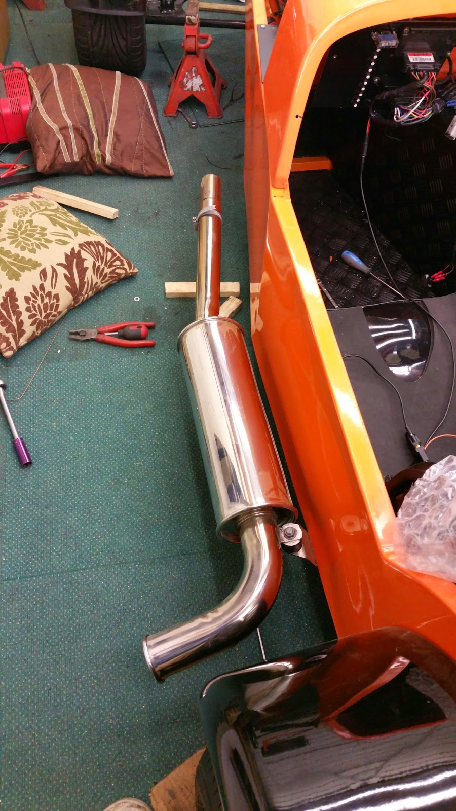 Started on the Exhaust at last decided we're going to make a mild steel one for now and maybe look into a stainless one later after IVA. Figured out we need two 90 degree bends and a short length of straight we also need a CAT too. We have to make it split to get it through the bodywork and up to the manifold. We used the support that came with the exhaust and drilled through the chassis then bolted it on so its really strong.